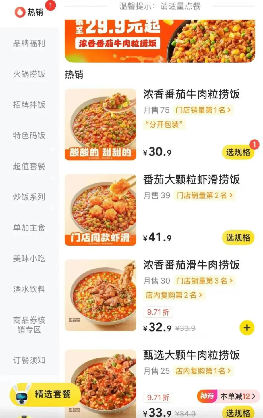 從價(jià)格上看,以上四大系列的產(chǎn)品券前價(jià)格集中在25.9-38.9元之間,同其他冒菜、小火鍋價(jià)格差不多。 疊加外賣平臺(tái)的紅包補(bǔ)助,濃香番茄牛肉粒撈飯到手價(jià)約25元。