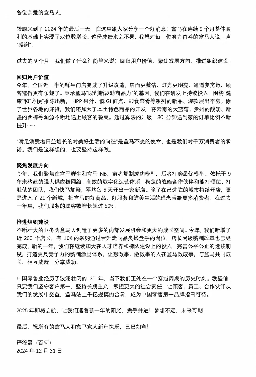 2024年3月,嚴(yán)筱磊接任盒馬CEO,盒馬開始了新一輪的戰(zhàn)略調(diào)整和組織變革。