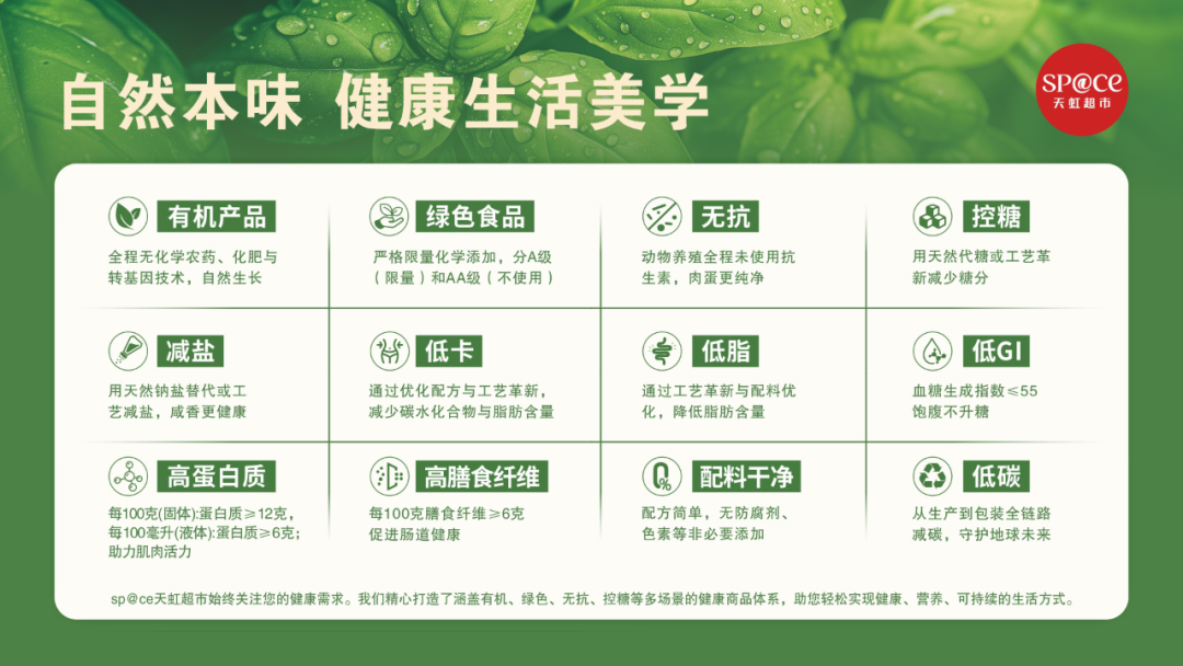 5月份,sp@ce天虹超市以《中國居民膳食指南》為藍(lán)本,構(gòu)建12類健康標(biāo)簽體系,科學(xué)覆蓋配料“干凈、有機(jī)、無抗、低GI、低卡”等12大維度,上架超1200種明確健康標(biāo)識(shí)商品。