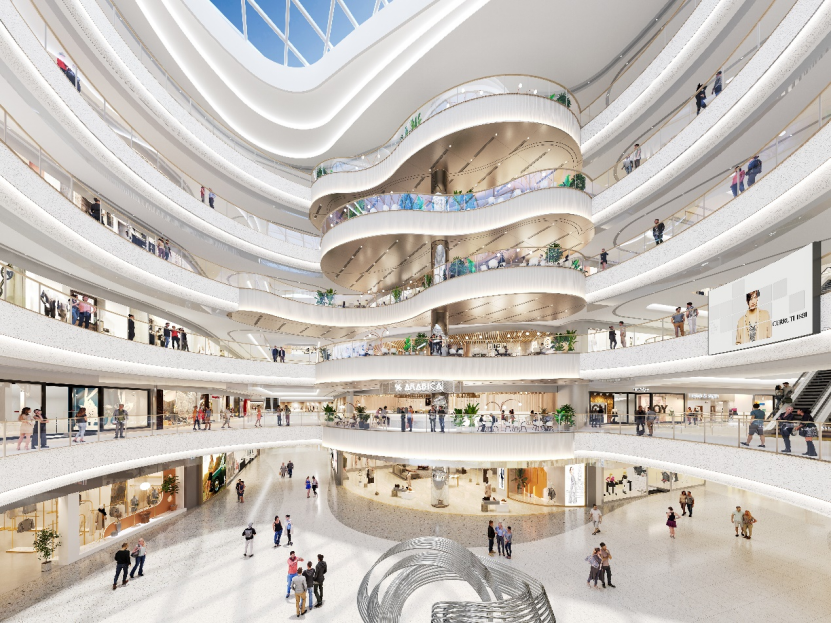 區(qū)別于傳統(tǒng)購物空間,上城天街以“湖光夏荷”為設(shè)計靈感,巧妙汲取相鄰豐收湖公園的自然意象,運用流動曲線塑造輕盈明快的中庭垂直商業(yè)視覺空間,營造一步一景的獨特體驗。