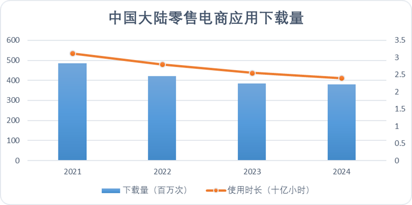 圖:中國(guó)大陸零售電商應(yīng)用下載量及使用時(shí)長(zhǎng)增速趨勢(shì),來(lái)源:Sensor Tower