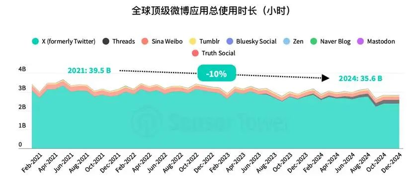 就連往日最堅(jiān)挺的社交媒體,也出現(xiàn)了下滑:過(guò)去三年間全球頂級(jí)文字短訊社交媒體——包括X、新浪微博、Threads等等,用戶總使用時(shí)長(zhǎng)下滑了10%。