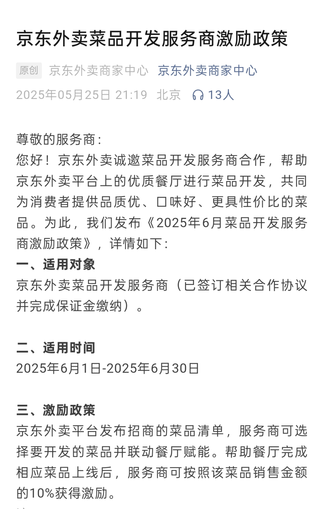 此外,京東外賣還啟動了“菜品開發(fā)”服務(wù),通過與菜品開發(fā)服務(wù)商合作,研發(fā)新菜品,為消費(fèi)者提供品質(zhì)優(yōu)、口味好、更具性價比的菜品。