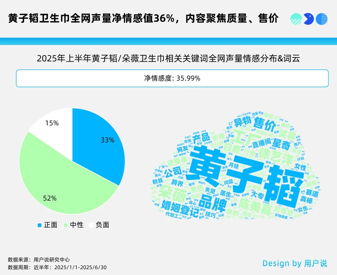 據(jù)用戶說監(jiān)測,朵薇目前全網聲量凈情感值僅36%,反映出消費者對其產品滿意度并不算高。與此同時,高頻反饋詞云中,“黃子韜”“婚姻登記”等突出表現(xiàn)也映射出朵薇當前階段仍主要由黃子韜流量驅動消費,產品核心競爭力與品牌壁壘未就。