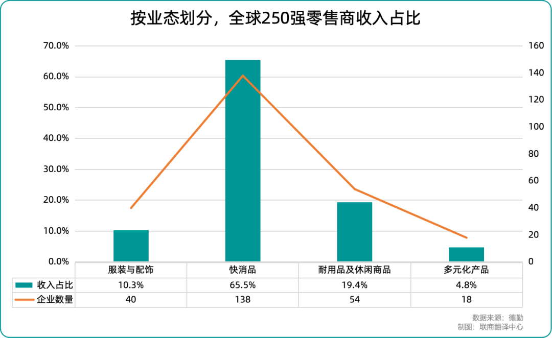 按業(yè)態(tài)劃分,“快消品零售”仍是主導(dǎo)力量,138家企業(yè)合計收入達3.95萬億美元(約合人民幣28.33萬億),占比高達65.5%!澳陀闷芳靶蓍e商品”業(yè)態(tài)以19.4%的占比位居第二,其次是“服裝與配飾”(10.3%)與“多元化商品”領(lǐng)域(4.8%)。盡管服飾領(lǐng)域的規(guī)模相對較小,但其凈利潤率高達9.8%,位居各業(yè)態(tài)之首。