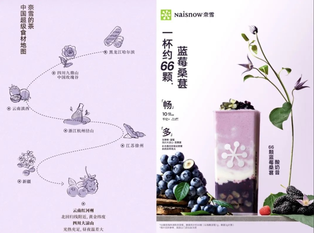 奈雪“66顆藍(lán)莓桑葚酸奶昔”,選用當(dāng)季云南紅河州鮮藍(lán)莓和四川大涼山黑桑葚,一杯花青素含量超標(biāo),主打高品質(zhì)路線;