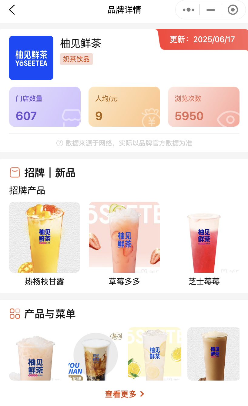 柚見鮮茶:全國門店607家,以江蘇為大本營(378家),主打“多肉葡萄”、“牛乳芋圓燒仙草”。