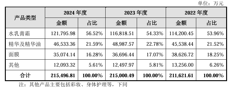植物醫(yī)生以高山植物護膚為特色,產品涵蓋了護膚、彩妝及身體護理等多個領域。其中,水乳膏業(yè)務占其營收大頭,2024年收入12.18億元,占總營收56.52%,其次是精華及精華油業(yè)務,收入4.65億元,占比21.59%,而目前線上旗艦店銷量最高的面膜產品,在去年占比營收總額僅16.28%。