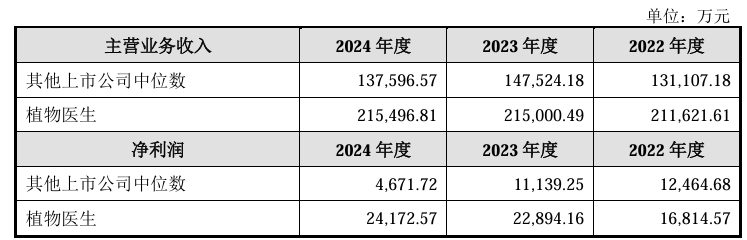 據(jù)招股書披露的信息,植物醫(yī)生2022年至2024年間公司分別實現(xiàn)主營業(yè)務收入21.16億元、21.50億元和21.55億元,凈利潤分別為1.68億元、2.29億元和2.42億元,公司主營業(yè)務毛利率分別為55.22%、60.34%和58.90%。截至2025年5月31日,公司擁有481家分公司。