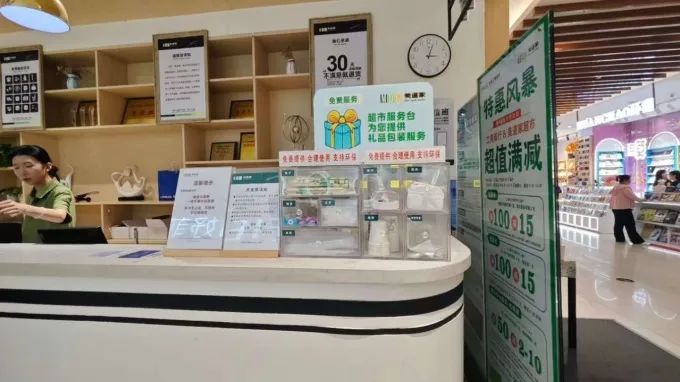 超市還設(shè)有寵物推車、醫(yī)療藥品、女性用品、免費(fèi)茶飲、免費(fèi)試吃等增值服務(wù),同時(shí)設(shè)有母嬰室、吸煙室等服務(wù)配套設(shè)施,還提供免費(fèi)配送、熨燙等多重免費(fèi)服務(wù)項(xiàng)目,也加強(qiáng)了員工服務(wù)意識(shí)的培訓(xùn),為顧客提供更多便利。
