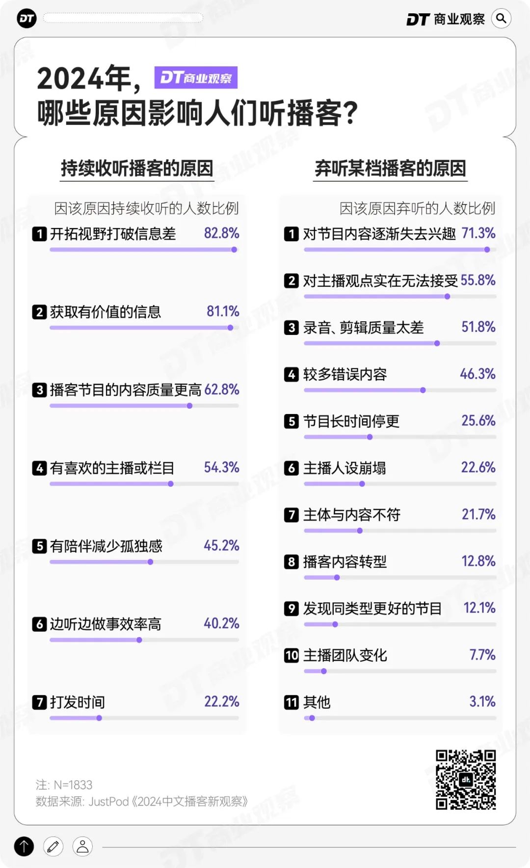 《2024中文播客新觀察》報(bào)告顯示,人們收聽播客主要有兩個(gè)原因,一是開拓視野、獲得有價(jià)值的信息;二是獲得陪伴感和情緒價(jià)值。