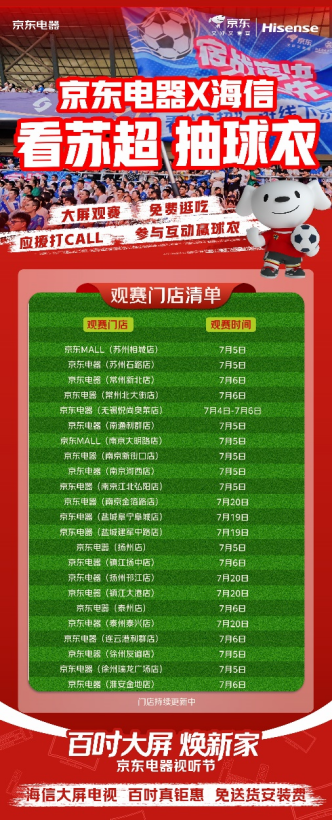 球迷可前往南京、蘇州、徐州、無錫、鹽城、連云港、淮安等城市的京東MALL及京東電器城市旗艦店,在百吋巨幕前為家鄉(xiāng)球隊吶喊助威。一邊納涼一邊看蘇超,抽限量版球衣,享美食。