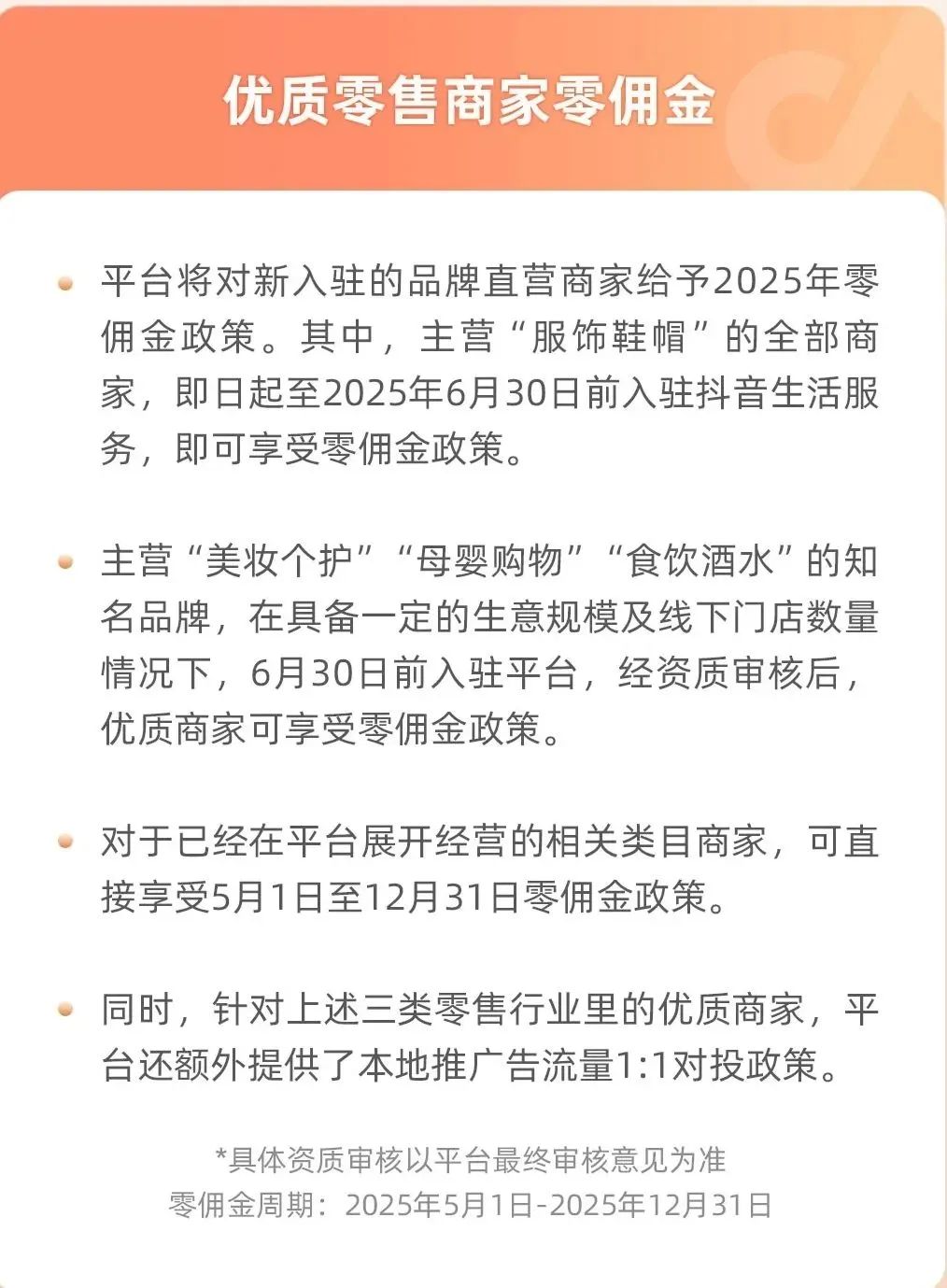抖音對(duì)平臺(tái)傭金政策進(jìn)行有升有降的調(diào)整,希望借此留住優(yōu)質(zhì)商家,同時(shí)篩選出能持續(xù)為平臺(tái)賺錢的商家。例如,對(duì)新入駐的品牌直營(yíng)商家給予2025年零傭金政策,服飾鞋帽類商家在2025年6月30日前入駐可享零傭金等。