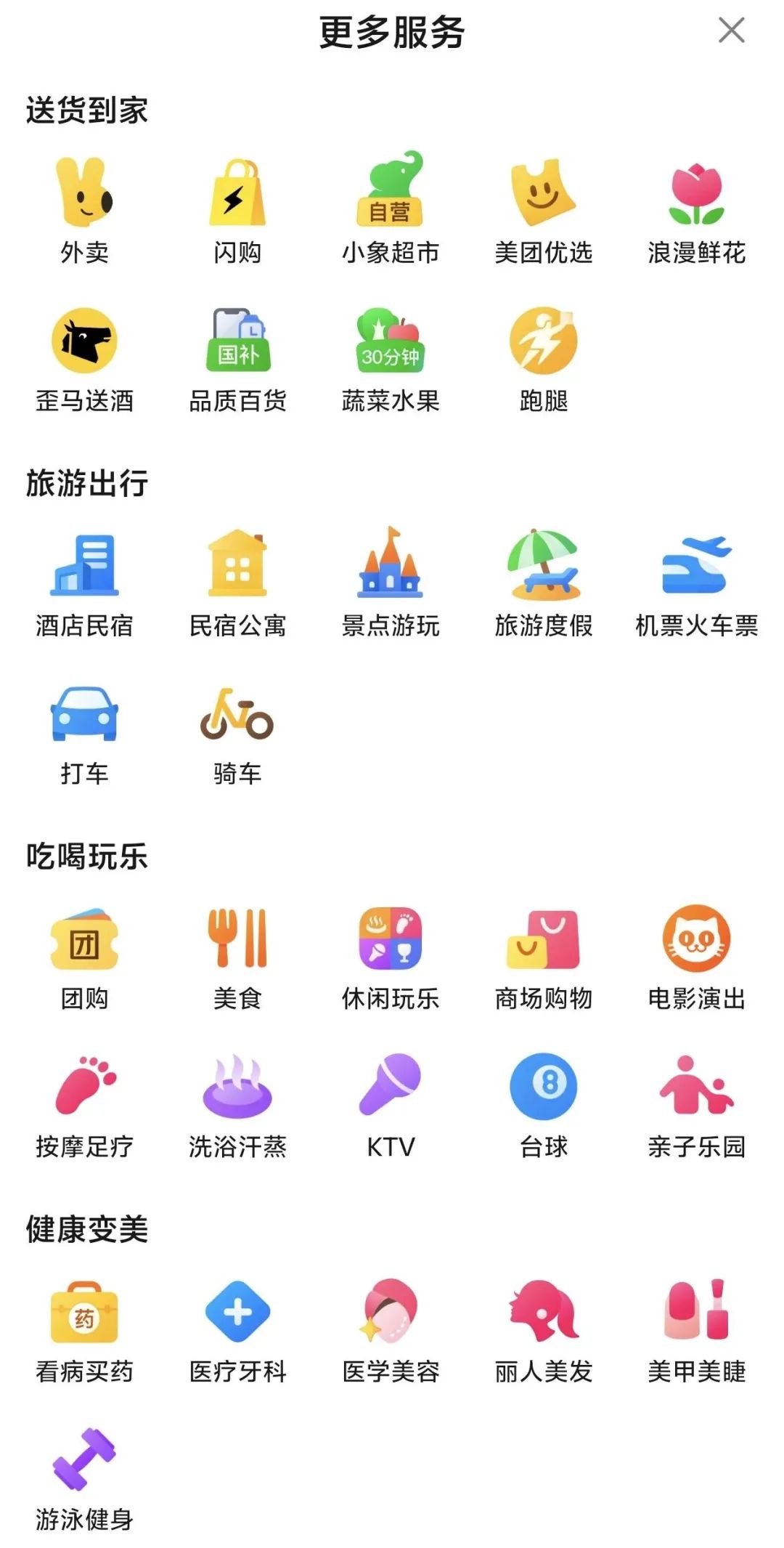 作為本地生活領(lǐng)域的早期開(kāi)拓者,美團(tuán)在外賣、到店、酒旅等核心業(yè)務(wù)上的市場(chǎng)占有率已逼近70%,其服務(wù)覆蓋外賣、酒店預(yù)訂、電影購(gòu)票、團(tuán)購(gòu)優(yōu)惠、藥品購(gòu)買、打車出行、跑腿代辦、美發(fā)預(yù)約等多元場(chǎng)景,是當(dāng)之無(wú)愧的本地生活服務(wù)巨頭。