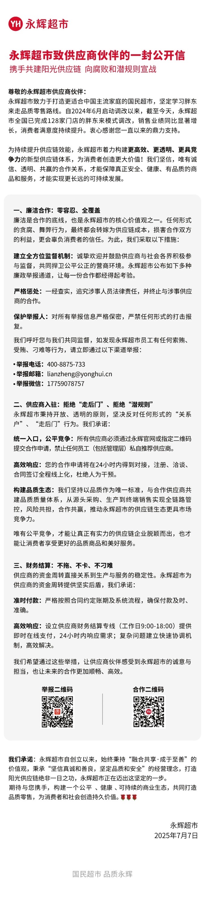 7月7日,永輝超市發(fā)布致供應商伙伴的一封公開信。在公開信中,永輝超市表示,將攜手共建陽光供應鏈,向腐敗和潛規(guī)則宣戰(zhàn)。