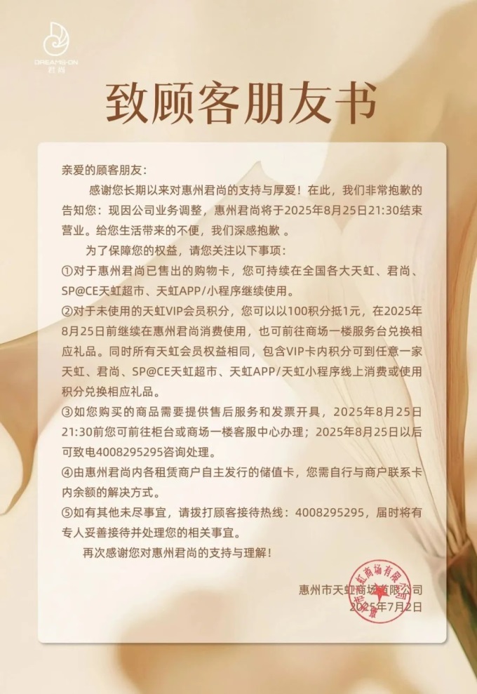 聯(lián)商快訊:近日,天虹商場旗下兩家門店分別官宣閉店。7月2日,惠州君尚百貨通過官方渠道發(fā)布結(jié)業(yè)聲明,明確因“公司業(yè)務(wù)調(diào)整”,門店將于2025年8月25日21:30正式停業(yè),即日起至閉店前正常運營并逐步推進善后工作。