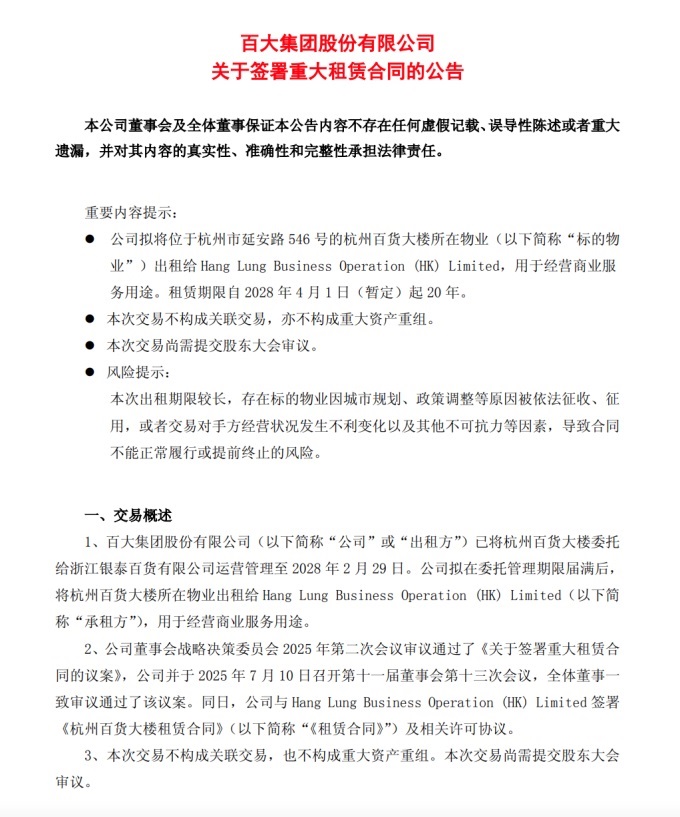 根據(jù)公告,杭州百貨大樓委托給浙江銀泰百貨有限公司運營管理至2028年2月29日,委托管理期限屆滿后,將直接出租給恒隆地產(chǎn)。本次租賃的杭州百貨大樓南、北樓物業(yè),合計租賃面積約4.2萬平方米,毗鄰杭州恒隆廣場。對此,百大方面表示,恒隆地產(chǎn)擁有豐富的商業(yè)運營管理經(jīng)驗,本次交易有助于提升物業(yè)價值。