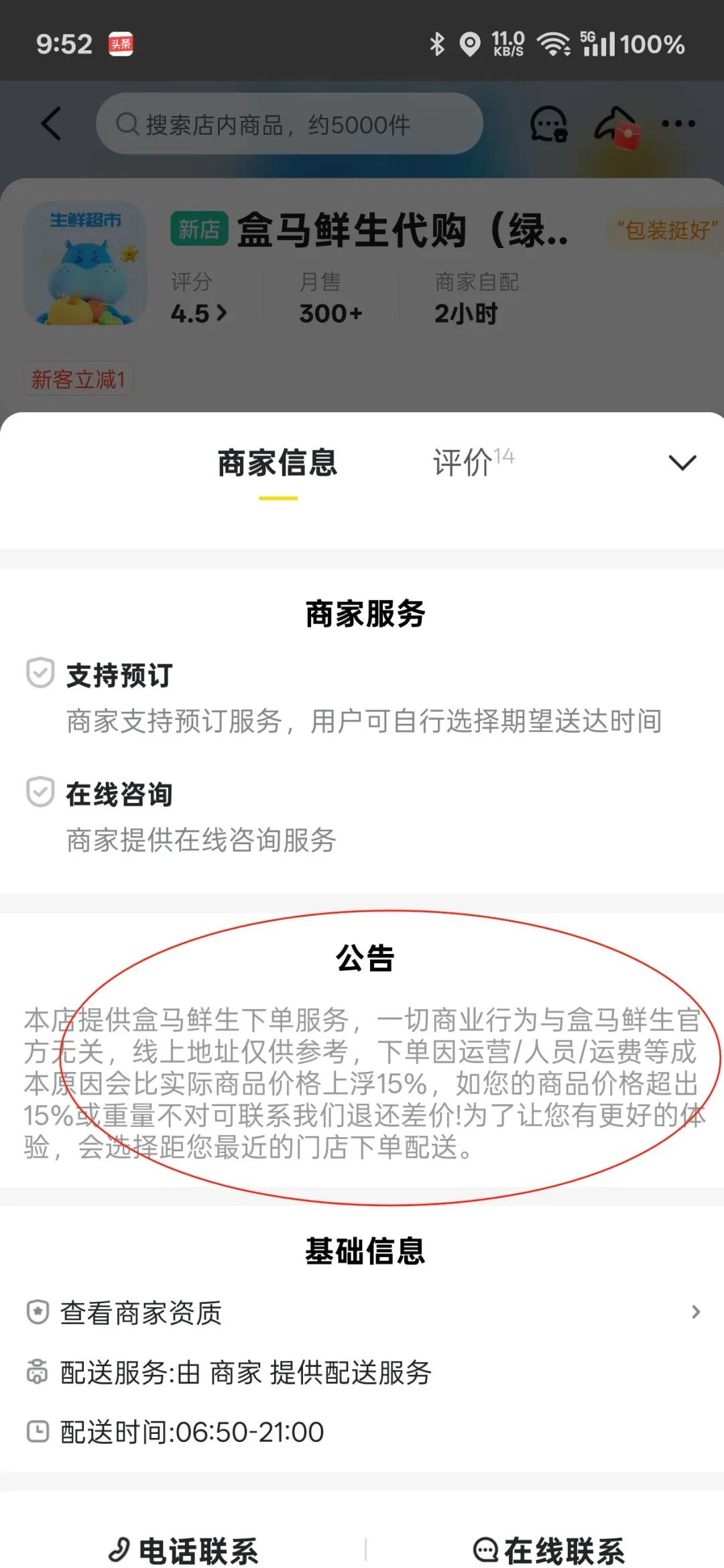 所謂店鋪的保障權(quán)益,在美團(tuán)的盒馬代購門店公告中稱:本地提供盒馬鮮生下單服務(wù),一切商業(yè)行為與盒馬鮮生官方無關(guān),線上地址僅供參考。京東和阿里平臺(tái)的售后保障,則都是由盒馬負(fù)責(zé),可以通過官方客服電話咨詢或者解決。