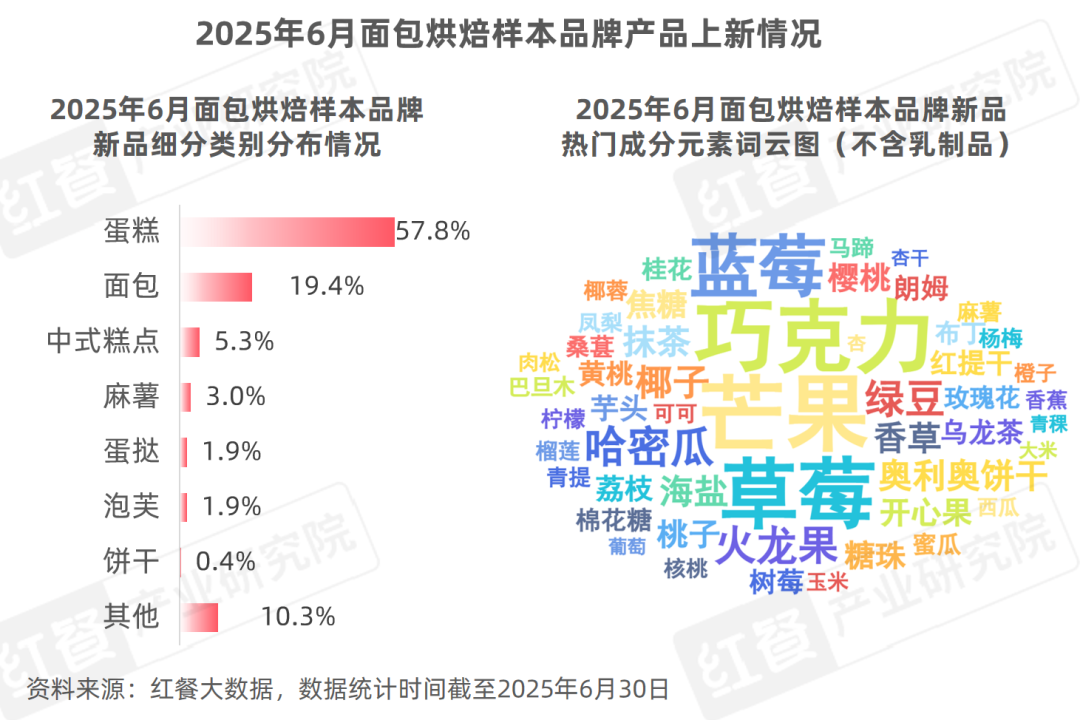 2025年6月,在紅餐產(chǎn)業(yè)研究院監(jiān)測的面包烘焙品牌中,有32個面包烘焙品牌共推出了263款新品。從面包烘焙品類新品的細分種類來看,蛋糕類新品數(shù)量最多,共推出了152款,占新品總數(shù)的57.8%。