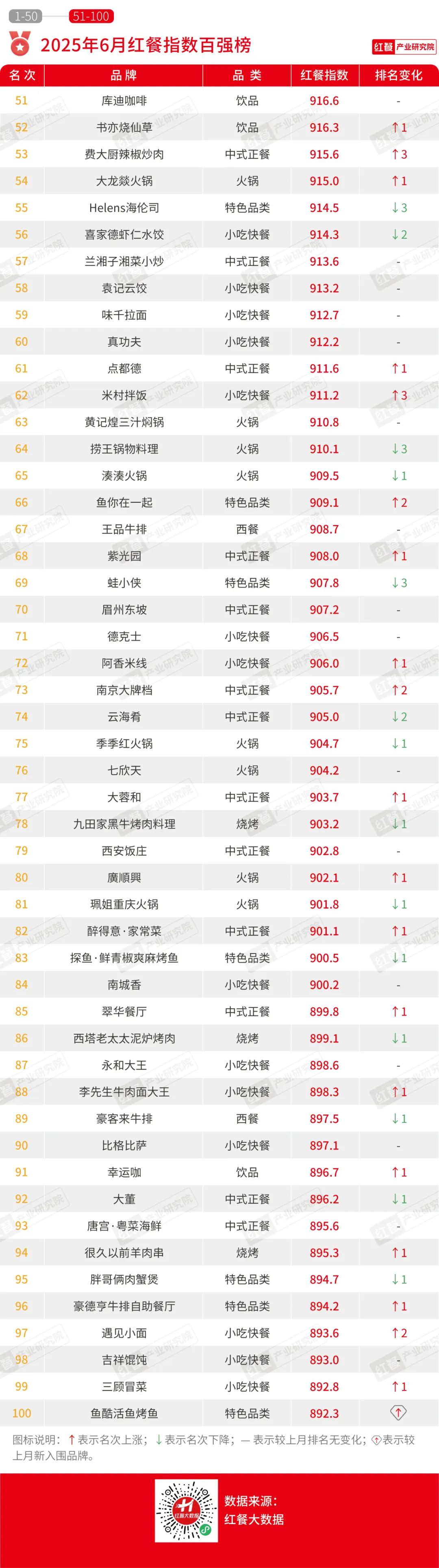 2025年6月,在“紅餐指數(shù)百強榜”中,品牌名次上升的有36個,名次下降的有33個,名次不變的有30個,新上榜品牌1個。排在榜單前三名的分別是海底撈、肯德基(中國)以及瑞幸咖啡,麥當勞(中國)、蜜雪冰城、星巴克(中國)、必勝客(中國)等緊隨其后。