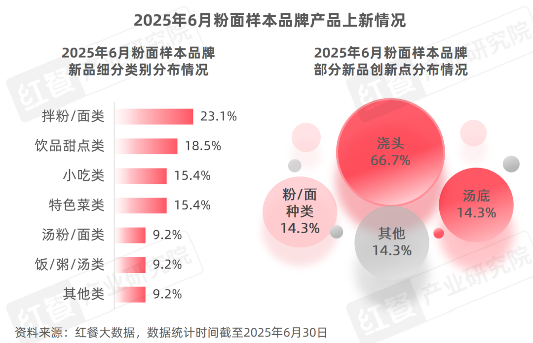 2025年6月,在紅餐產(chǎn)業(yè)研究院監(jiān)測的61個粉面品牌中,有21個品牌共推出了65款新品,當月粉面新品涵蓋的類別有拌粉/面類、飲品甜點類、小吃類、特色菜類、湯粉/面類和飯/粥/湯類。