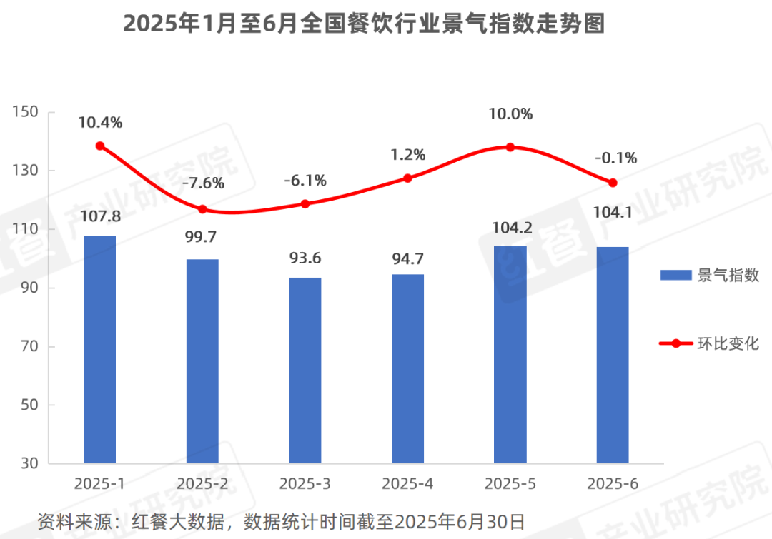 紅餐大數(shù)據(jù)顯示,2025年6月全國餐飲行業(yè)景氣指數(shù)為104.1,較5月的104.2微降0.1%,整體仍保持在較高水平。