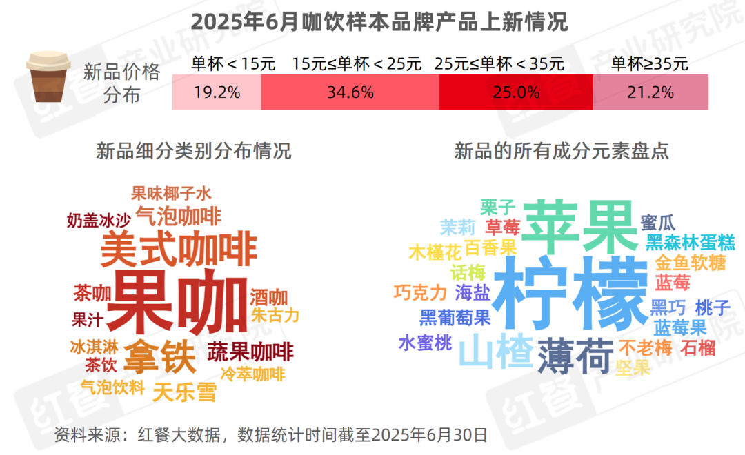從價格分布來看,6月咖飲品牌的新品價格分布主要集中在15元≤單杯<25元和25元≤單杯<35元兩個區(qū)間內(nèi),占比分別為34.6%和25.0%。