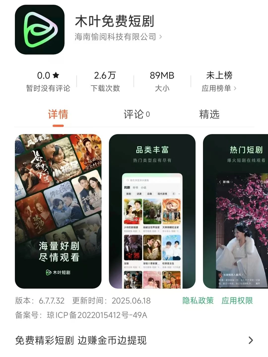 此外,淘寶、抖音這些平臺(tái)也在加緊籌備短劇,不斷擴(kuò)大投入。前幾天字節(jié)跳動(dòng)就上線了一款新的短劇APP“木葉免費(fèi)短劇”。