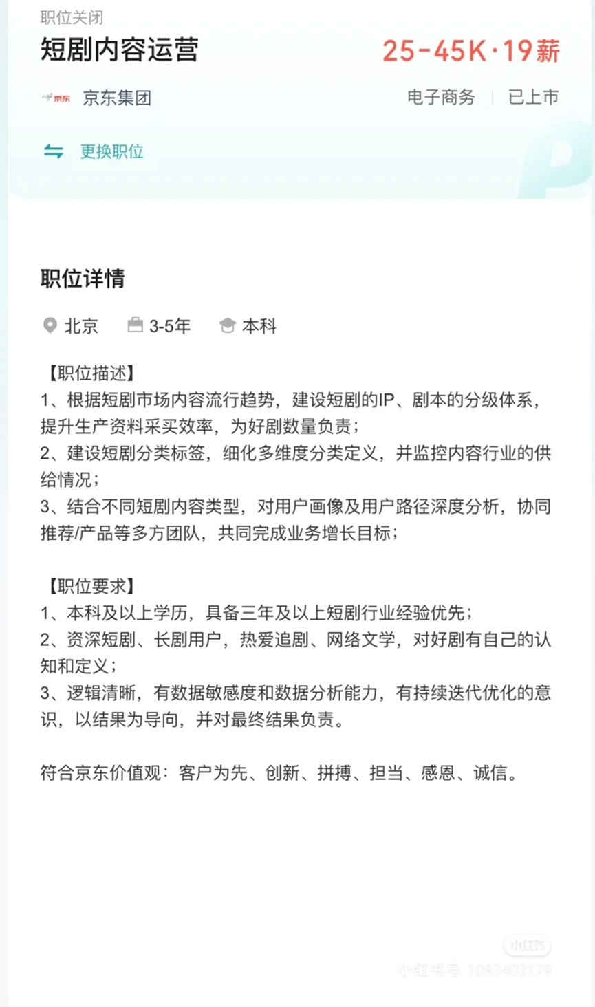 高薪擺在這兒,京東的招聘標(biāo)準(zhǔn)自然不低。公開信息顯示,京東要求應(yīng)聘者具有本科及以上學(xué)歷,具備三年及以上短劇行業(yè)經(jīng)驗(yàn)優(yōu)先;是資深短劇、長(zhǎng)劇用戶,熱愛追劇、網(wǎng)絡(luò)文學(xué),對(duì)影視劇行業(yè)要有自己的深刻認(rèn)知。