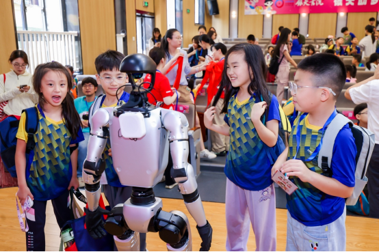開(kāi)營(yíng)儀式上熱鬧非凡,銀泰百貨的機(jī)器人員工 “小泰” 一亮相便深受孩子們的歡迎。孩子們爭(zhēng)相與 “小泰” 握手、擁抱,在歡快的音樂(lè)聲中,還跟著 “小泰” 一起跳舞,現(xiàn)場(chǎng)充滿了歡聲笑語(yǔ)。北京大學(xué)新信院青少年AI教育實(shí)驗(yàn)室課研組研究員布丁老師(褚文希)為學(xué)員帶來(lái)了“開(kāi)營(yíng)第一課”《用AI重新定義學(xué)習(xí)的可能性》。