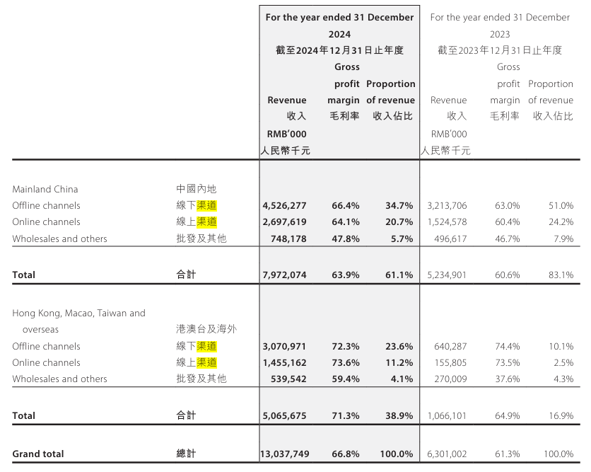泡泡瑪特2024年財報顯示,2024年泡泡瑪特營收130.4億元人民幣,同比增長106.9%。在這驚人的漲幅下,線下渠道成為關鍵引擎。其財報顯示,中國內(nèi)地貢獻了61.1%的集團收入占比,其中,中國內(nèi)地的線下渠道更是為集團提供了34.7%的收入貢獻,高達45.26億元,同比增長了40.8%,成為泡泡瑪特貢獻收入最多的渠道。