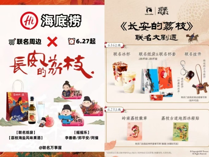長安的荔枝上映,根據(jù)AI整理的數(shù)據(jù),差不多吸引了大大小小30多家品牌的聯(lián)名或者蹭熱點,有些是玩諧音梗,有些是推出應季飲品(如酸奶、冰棍等),有些是劇情植入。
