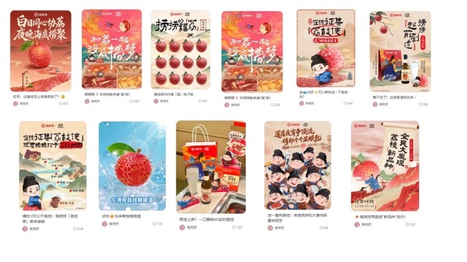 在小紅書@海底撈官方賬號粉絲33萬,一共發(fā)布本次聯(lián)名相關筆記11條,內(nèi)容涉及到官宣預熱、征集荔枝使活動、聯(lián)名禮品介紹、簡單互動小游戲選擇福荔、聯(lián)名產(chǎn)品介紹、聯(lián)名產(chǎn)品上新官宣,夢回大唐找侍郎活動,每一條筆記互動在幾百左右,沒有一條破千的筆記,整體內(nèi)容比較單薄,傳播力度遠遠不夠,整個內(nèi)容的話題度不夠。這些筆記的總贊量是2400,篇均240左右,總筆記的贊量都比不上瑞幸的篇均數(shù)據(jù)。