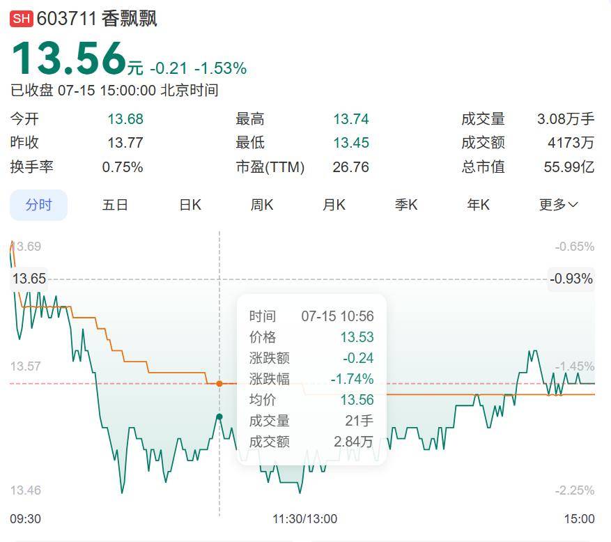 發(fā)布預(yù)虧公告后,7月14日,香飄飄開盤下跌,當(dāng)天報收13.77元/股,下跌0.51%。截至7月15日收盤,報13.56元/股,相較當(dāng)天開盤價下跌0.88%,總市值為55.99億元。