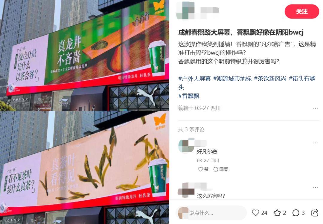 頗有意思的是,成都快閃店營業(yè)期間,香飄飄還在春熙路3D大屏連續(xù)投放巨幅廣告:“沒點分量憑什么以茶會客?”“不到明前拿什么上新”!耙圆钑选笔前酝醪杓У膕logan,彼時正逢霸王茶姬近期也發(fā)布了包含龍井茶的新品“醒時春山”。