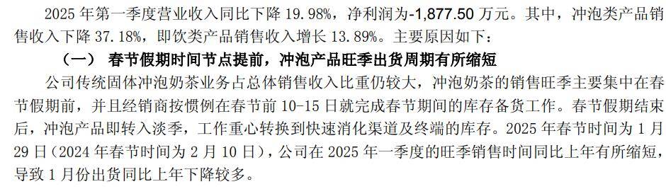 對于業(yè)績預(yù)虧的原因,香飄飄表示,主要是受到兩方面的影響。一方面,公司傳統(tǒng)沖泡產(chǎn)品在旺季銷售承壓,疊加春節(jié)時點相比上年度有所提前,一季度的旺季持續(xù)時間縮短,沖泡業(yè)務(wù)提早進(jìn)入淡季。另一方面,公司為維護(hù)經(jīng)銷商及終端的利益,堅持“以動銷為原則”,主動降低渠道庫存水平,嚴(yán)格確保渠道及終端庫存的良性健康,為下半年沖泡旺季的鋪貨及動銷打好基礎(chǔ)。