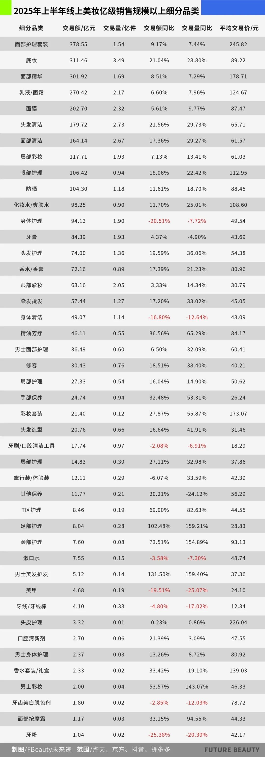 為了進一步了解品類趨勢,《FBeauty未來跡》篩選出今年上半年交易規(guī)模在億元以上的細分品類,其中,面部護理套裝、底妝、面部精華以超300億元的交易規(guī)模位居前三。