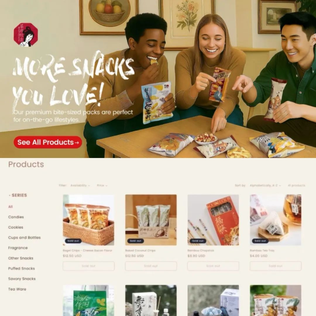 更巧的是,就在同一個(gè)月,茶顏悅色悄悄在美國(guó)開了線上店,用的是Shopify的獨(dú)立站,還同步上線了亞馬遜和TikTok Shop,賣的是碧根果、小魚干一類的零食。而我喝到的這杯茶,是我點(diǎn)了“一問(wèn)三不梔”之后,店員笑瞇瞇地喊了一句:“小主,您的飲品好啦~”
