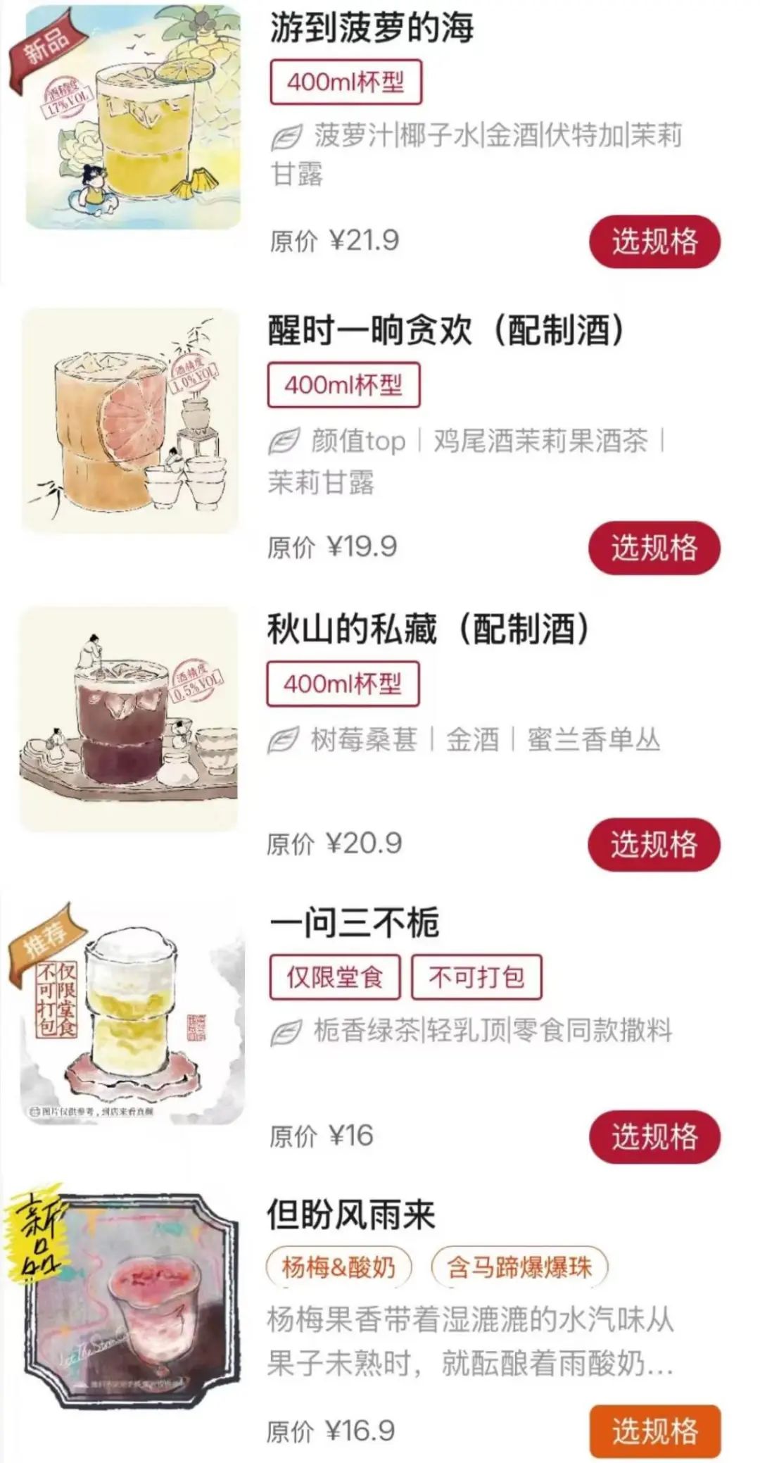 2024年,它還上線了“晝夜詩(shī)酒茶”這個(gè)新子品牌,并非只是原有菜單的延伸,而是直接做了“酒+茶+餐”的組合,空間和服務(wù)都做了明顯的區(qū)隔。開業(yè)第一周,就吸引了一堆長(zhǎng)沙網(wǎng)友打卡,有人說(shuō)“這可能是茶顏悅色最有野心的一次試水”。