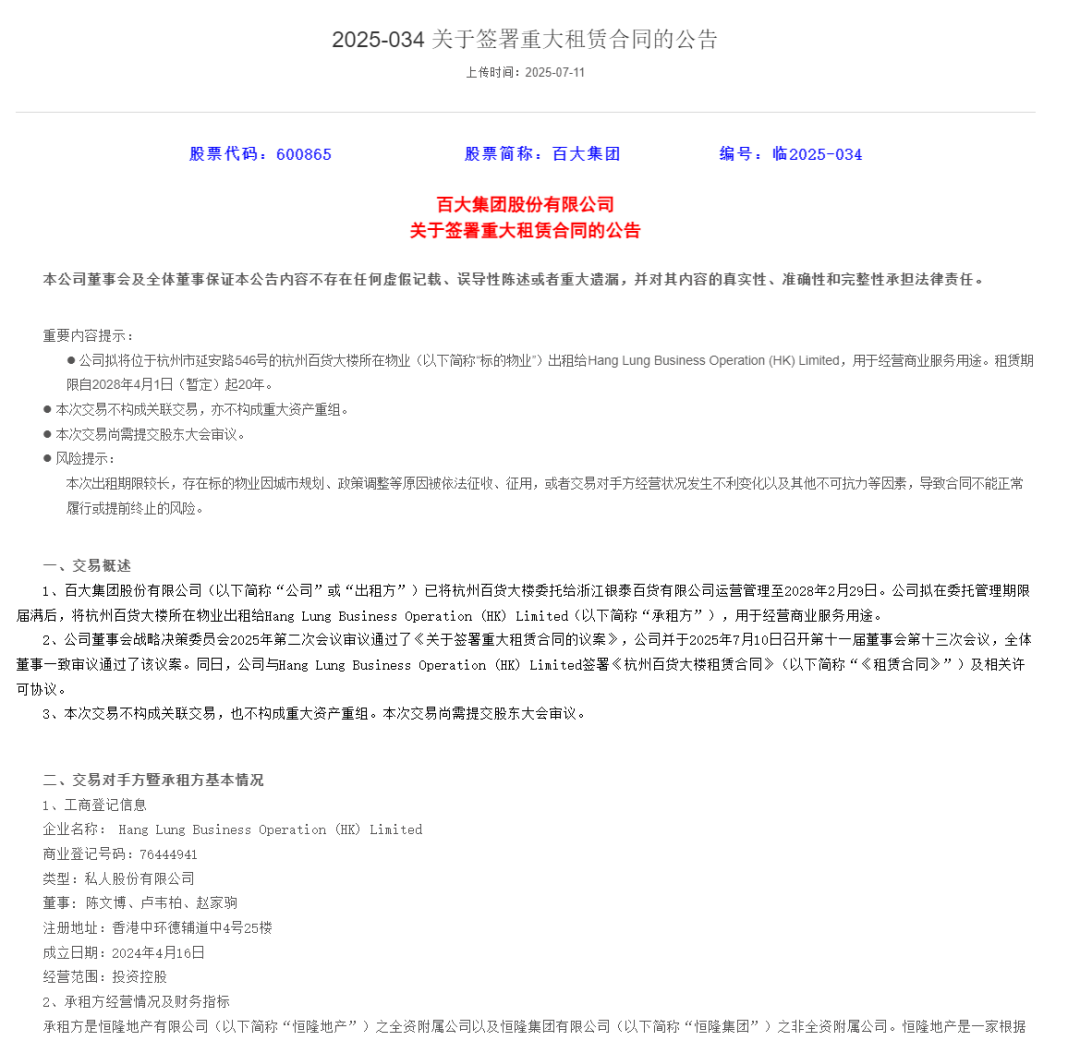 近期,百大集團發(fā)布了公司關于簽署重大租賃合同的公告,宣布與恒隆地產達成合作;