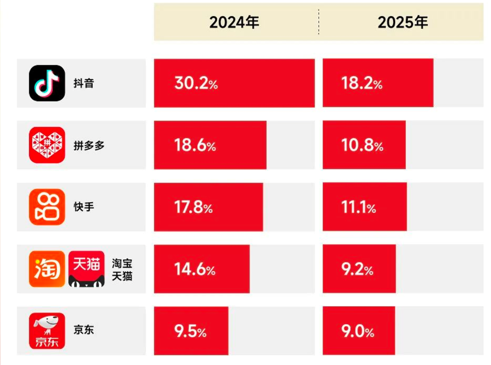 星圖數(shù)據(jù)顯示,2025年618大型電商平臺整體GMV(商品交易總額)同比增長了15.2%。數(shù)字看起來還湊合。只是,這光鮮的增長率,并非用戶購買率同比去年提升了,而是因為618時間拉長了。今年的618周期,相比去年拉長了近20%,如果考慮上這一時間因素,618的GMV增長甚至都沒能跑贏拉長的時長。也難怪,近兩年各家都不再公布GMV數(shù)字了。
