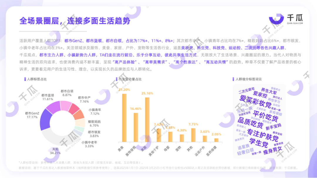 根據(jù)千瓜數(shù)據(jù),小紅書用戶以年輕女性群體為主,集中18-34歲,主要分布在一二線城市,追求時(shí)尚、美好生活,消費(fèi)意愿和能力較強(qiáng)。