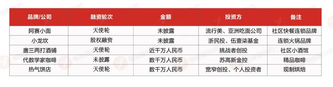 此外,連鎖火鍋品牌“小龍坎”完成了一輪股權(quán)融資,精品咖啡品牌“代數(shù)學(xué)家咖啡”完成第五輪融資。