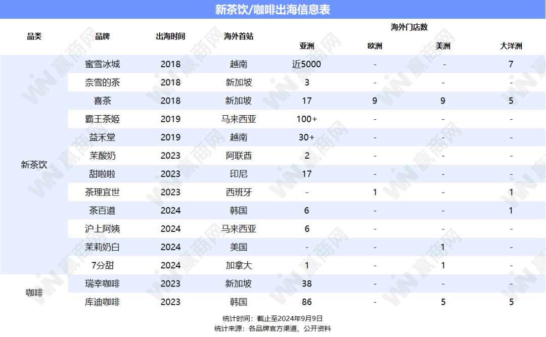 贏商網(wǎng)的數(shù)據(jù)顯示,出海已成為各大新茶飲和咖啡品牌未來(lái)發(fā)展的重要一環(huán),東南亞地區(qū)因地理位置、文化相似性以及巨大的市場(chǎng)潛力,成為品牌出海的首選。同時(shí),品牌們?cè)跉W美市場(chǎng)的探索和布局正逐漸加速。