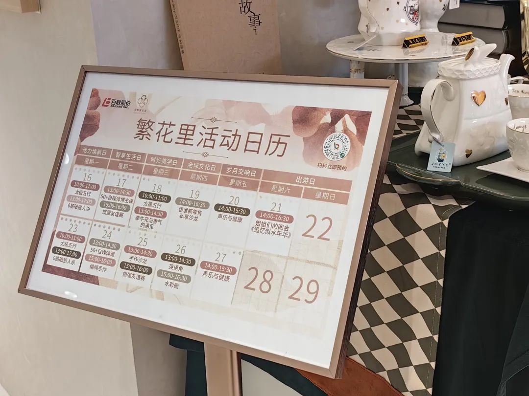 但空間的重點(diǎn)并不在零售,而是位于店內(nèi)兩端的沙龍區(qū)與茶歇區(qū)。兩處區(qū)域主要承接課程培訓(xùn)、游戲聚會(huì)等社群活動(dòng)。有別于常規(guī)的老年教育,繁華里除了提供花藝茶藝等興趣培訓(xùn),“課程表”中涵蓋的自媒體技能、英語(yǔ)學(xué)習(xí)、閱讀分享、穿搭技巧等課程更像是年輕人專屬。
