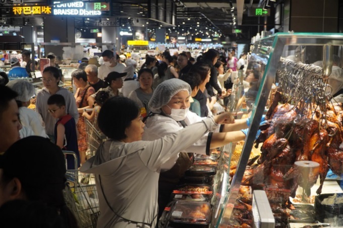 熟食區(qū)的升級力度令人印象深刻,透明廚房讓烹飪過程一目了然,新增的早餐、夜宵、家庭聚餐等場景化產(chǎn)品琳瑯滿目。江西本土鹵味品牌“煌上煌”的鴨脖、鴨翅、鴨掌等地道的香辣鮮香產(chǎn)品占據(jù)顯眼位置。