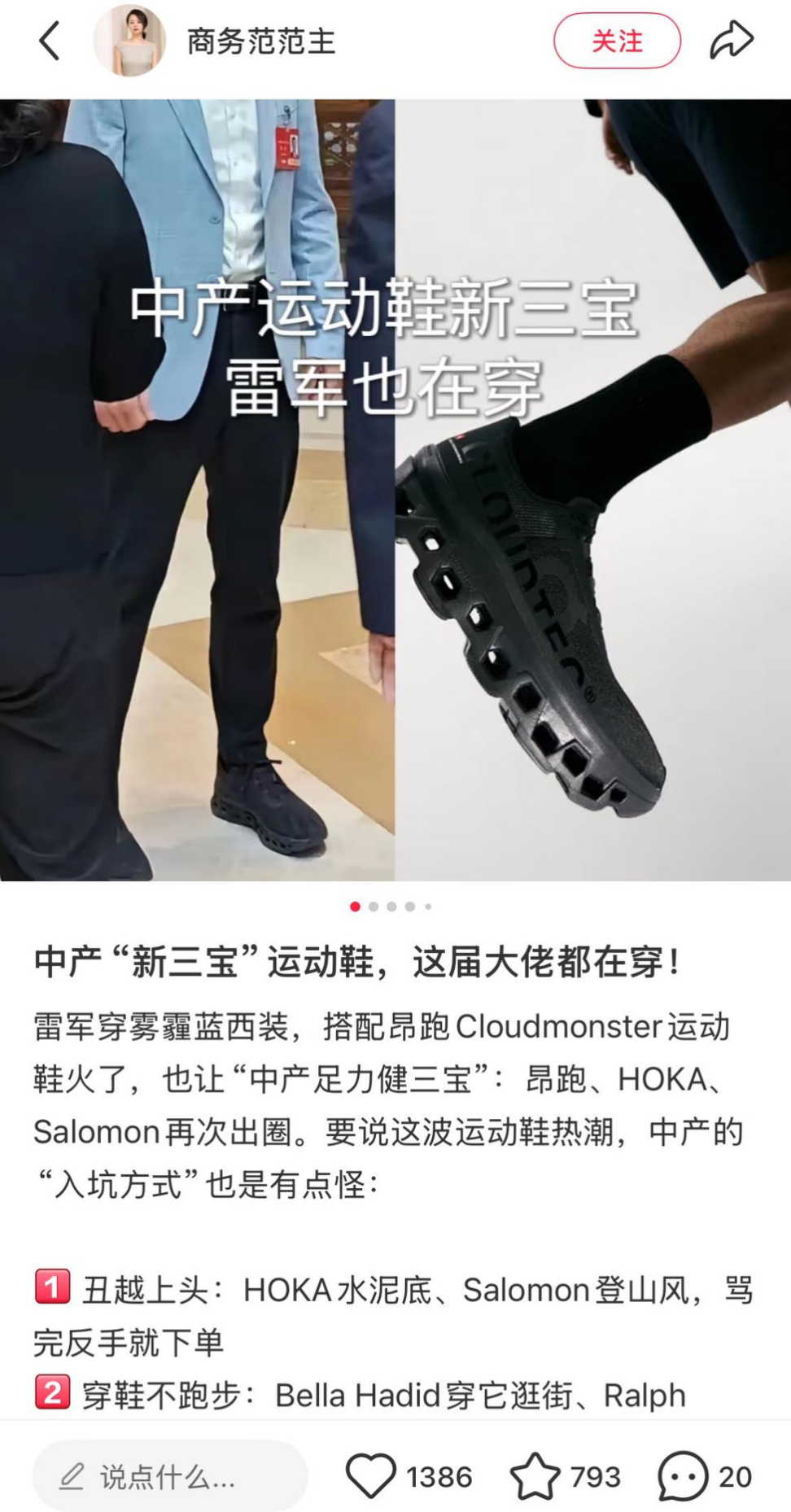 在小紅書“工鞋推薦”的高贊筆記里,HOKA頻繁上榜,護士、教師、銷售等需要長時間站立的人群,幾乎把它“焊”在了腳上。HOKA也被稱為是“中年足力健”,就連馬斯克、雷軍也穿上了HOKA。
