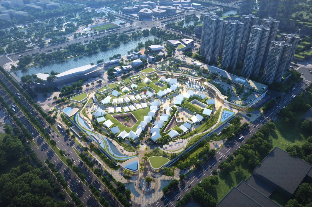 其設(shè)計(jì)打破了傳統(tǒng)的商業(yè)體建筑形態(tài),采用了開放式街區(qū)、獨(dú)棟三角屋等建筑手法,詮釋了項(xiàng)目獨(dú)特的微度假、國際范以及濱海風(fēng)情。