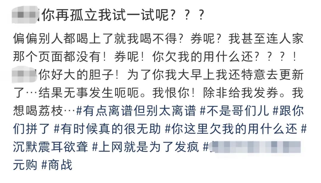 還有網(wǎng)友懷疑自己被“做局”了,直接在社交媒體上“發(fā)瘋”,喊話某平臺(tái):“你再孤立我試一試呢?偏偏別人都喝上了就我喝不得?券呢?我甚至連人家那個(gè)頁(yè)面都沒(méi)有!券呢?你欠的我的用什么還?”