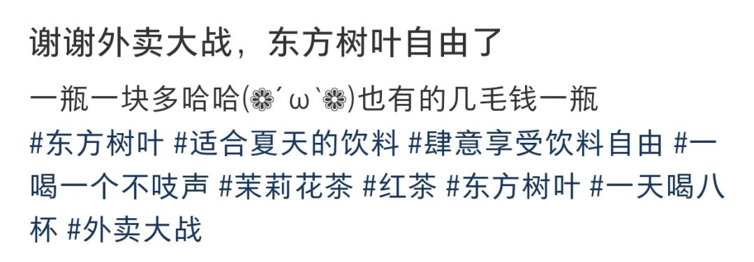 對(duì)此,也有聰明的網(wǎng)友建議大家買(mǎi)生餛飩、水餃、雞蛋、礦泉水,囤一些日用品這些耐放的。還有網(wǎng)友表示,減肥人非要參與外賣(mài)大戰(zhàn),就一味地買(mǎi)水,買(mǎi)紅薯、買(mǎi)椰子水。“感謝外賣(mài)大戰(zhàn),東方樹(shù)葉自由了!